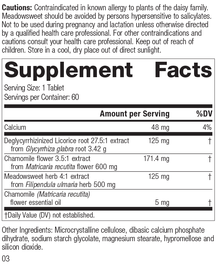 Each Serving Size (1 Tablet) contains: Calcium 48 mg, Deglycyrrhizinized Licorice root 27.5:1 extract 125 mg (from Glycyrrhiza glabra root 3.42 g), Chamomile flower 3.5:1 extract 171.4 mg (from Matricaria recutita flower 600 mg), Meadowsweet herb 4:1 extract 125 mg (from Filipendula ulmaria herb 500 mg), Chamomile (Matricaria recutita) flower essential oil 5 mg. Other Ingredients: Microcrystalline cellulose, dibasic calcium phosphate dihydrate, sodium starch glycolate, magnesium stearate, hypromellose and silicon dioxide.
