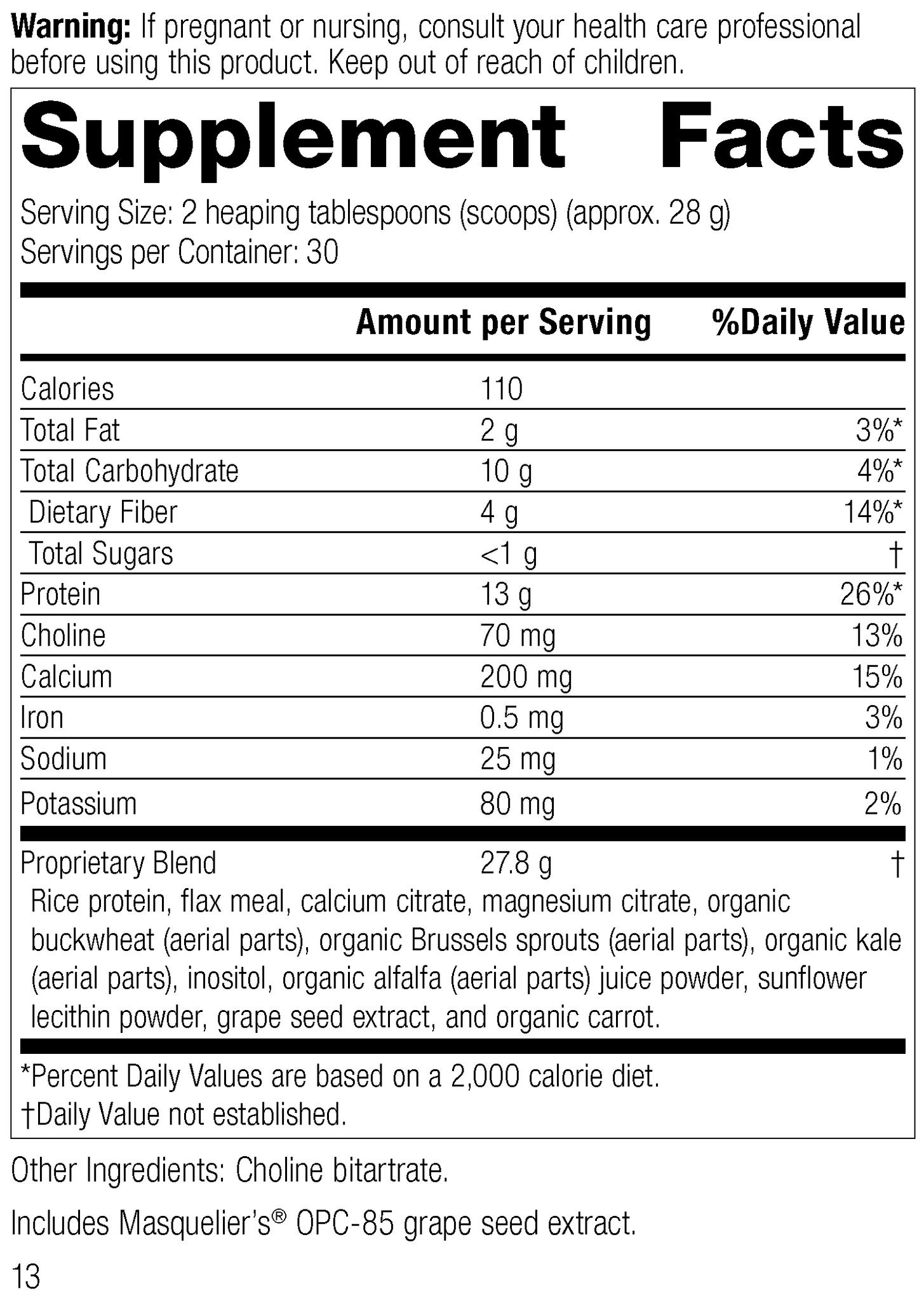 Each Serving Size (2 heaping tablespoons) contains: Calories 110, Total Fat 2 g, Total Carbohydrate 10 g, Dietary Fiber 4 g, Total Sugars <1 g, Protein 13 g, Choline 70 mg, Calcium 200 mg, Iron 0.5 mg, Sodium 25 mg, Potassium 80 mg. Proprietary Blend 27.8 g: Rice protein, flax meal, calcium citrate, magnesium citrate, organic buckwheat (aerial parts), organic Brussels sprouts (aerial parts), organic kale (aerial parts), inositol, organic alfalfa (aerial parts) juice powder, sunflower lecithin powder, grape seed extract, and organic carrot. Other Ingredients: Choline bitartrate.